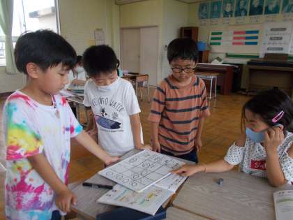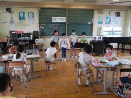 7月9日(金) 2年生音楽 みのまわりの音で音楽をつくろう 公開日 2021/07/09 更新日 2021/07/09 2年生 「ワンワン」「ミーンミンミン」等、身の回りの音で音楽をつくりました。 音の大きさを変えたり、動作を付けたりするなど、それぞれのグループが工夫して取り組みました。