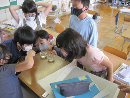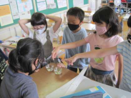 7月9日(金) 5年生 理科 魚のたんじょう 公開日 2021/07/09 更新日 2021/07/09 5年生 今日新たにメダカの卵を採取して、2日前に採取した卵との違いを比べました。 子供たちは片方の卵が黒く見えることから目ができてきていることに気付きました。 孵化するまで卵の成長を継続的に観察しようという意識を高めていました。