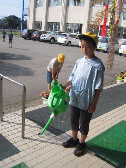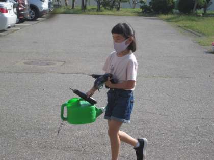 7月14日(水) 朝の風景 公開日 2021/07/14 更新日 2021/07/14 朝日小学校NEWS 今日はよい天候です。 元気いっぱいに登校してきました。 登校後は、畑へ収穫にでかける子供、水やりをしている子供、とそれぞれ活動しています。 ナスをたくさん収穫して戻ってくる子供も。 水やり用のじょうろにトンボが止まっています。撮影し終わるまでじっとしていてくれるトンボです。