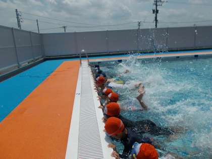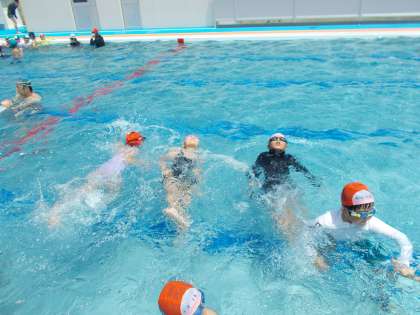 「フクラギチーム」は、ジャンケン等をして水に慣れた後、けのびやバタ足、背泳ぎの基本等を学びました。
