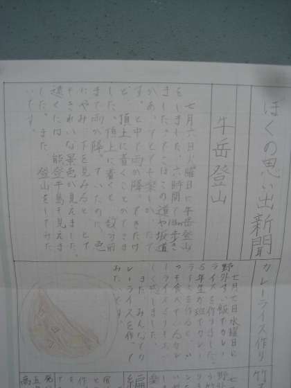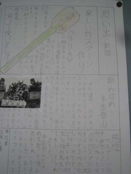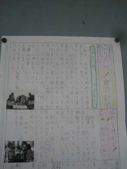 7月14日(水) 5年生 宿泊学習新聞完成! 公開日 2021/07/14 更新日 2021/07/14 5年生 宿泊学習新聞が完成しました! どの新聞にも登山がたのしかったこと、野外炊飯のカレーが美味しかったこと等がもれなく書いてあります。 思い起こせば、ちょうどあれから一週間経ったのですね。時の経つのは早いものですね。