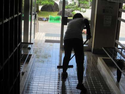 助手さんが、泥だらけになった玄関前や児童玄関を掃除してくださっています。