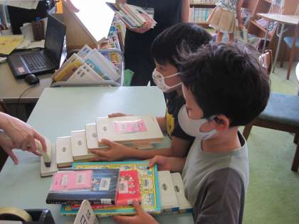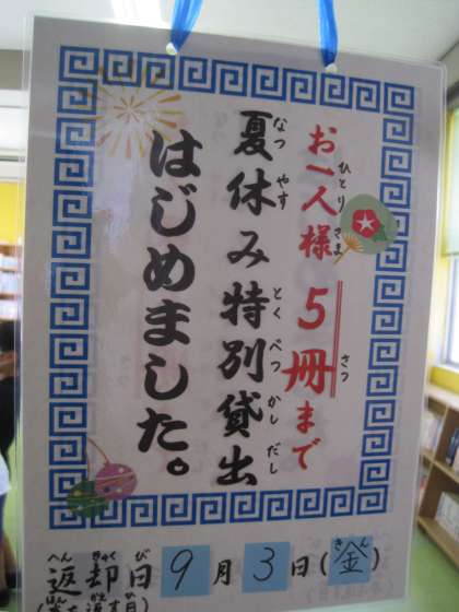 7月16日(金) 夏休み特別貸出はじめました! 公開日 2021/07/16 更新日 2021/07/16 育友会 図書室前には、中華料理店前にかかっているものとよく似たお知らせが下がっています。 「冷やし○○始めました」ならぬ、「夏休み特別貸出はじめました!」です。 なんと!一人5冊まで借りることができます!プラスワンカードを持っている子供は、さらに1冊追加で借りることができます。 図書室は大賑わいです。重くて持ち帰れないかもしれませんよ。