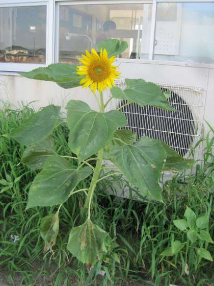 2年生教室前に大きな大きなひまわりが花を咲かせました。