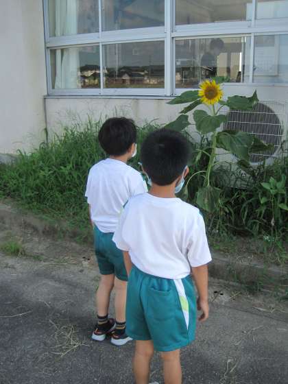 太陽に向かって、堂々と咲いています。2年生とほぼ同じ高さです。