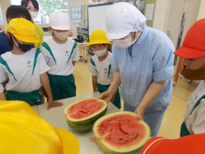 本日、給食最終日に全校に振る舞います。地域のスイカ名人さんの取材として、テレビ局も試食の様子を取材に来られます。