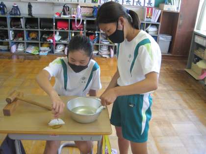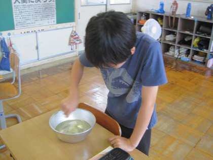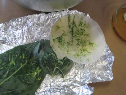 7月20日(火) 6年生 理科 葉の養分 公開日 2021/07/20 更新日 2021/07/20 6年生 インゲン豆の葉を使った実験です。 一枚は、日光に当てたもの、もう一枚は、アルミ箔で覆っておいたものです。 ヨウ素に付けて色の変化を観察しています。予想は当たったかな。