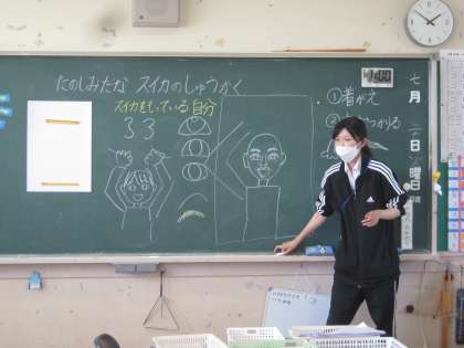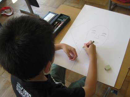 7月20日(火) 3年生 図画工作科 スイカを喜ぶ自画像 公開日 2021/07/20 更新日 2021/07/20 3年生 大きな画用紙いっぱいに、スイカを収穫して喜んでいる自分を描きます。 自画像とスイカのコラボ企画です。タイミングのよい課題ですね。