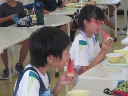 7月20日(火) スイカの試食 その2 公開日 2021/07/20 更新日 2021/07/21 朝日小学校NEWS 今日のスイカの糖度は、「13度」とのこと。 名人さんのスイカは、16度にもなるそうです。 畑のスイカは、3・4年生がそれぞれ家に持ち帰ります。