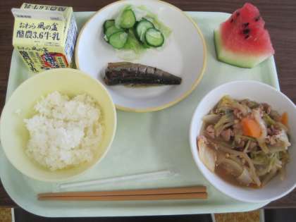 最終日は、朝日小学校だけ特別に「スイカ」が付いています。3・4年生が育てたスイカを調理員さんが上手に切ってくだいました。