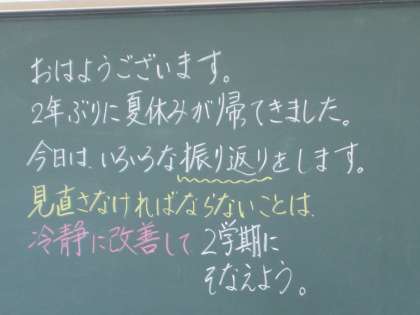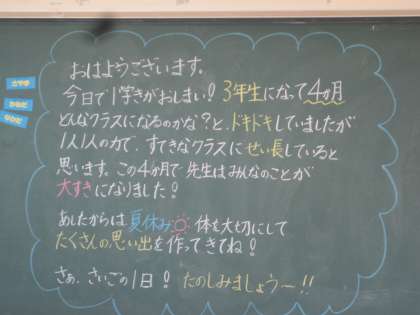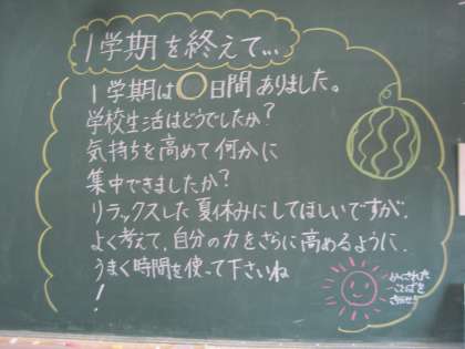 7月21日(水) 今日は終業式 公開日 2021/07/21 更新日 2021/07/21 朝日小学校NEWS 1学期も今日で終わり、明日から夏休みです。 昨年度は、ほとんど夏休みがなかったので、2〜6年生にとっては2年ぶりの夏休みですね。1年生にとっては、小学校での初めての夏休みです。 教室の黒板には、担任の先生からの温かなメッセージが子供たちを迎えました。 最後の1日、しっかり締めくくりましょう。