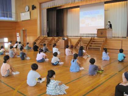 朝日小学校体育館は、風通しがよいので、扉や窓を全開にし、大きな扇風機を2台稼働し、子供たちも距離を十分にとった状態で、終業式を行いました。