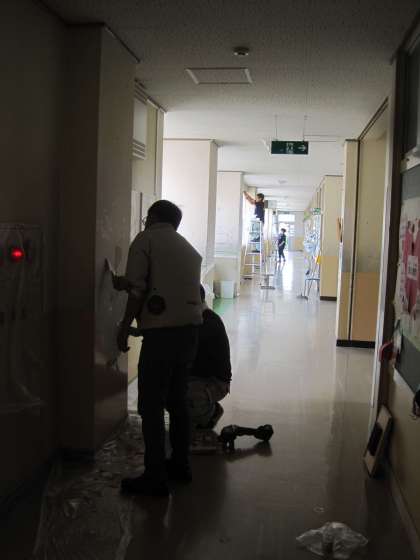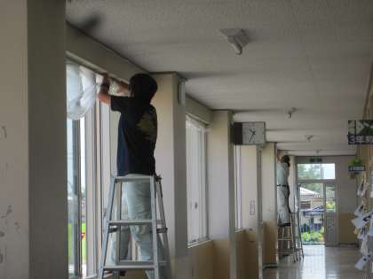 他の学校の用務員さん方もたくさん手伝いに来てくださり、朝日小学校の壁を塗り替える作業をしておられます。