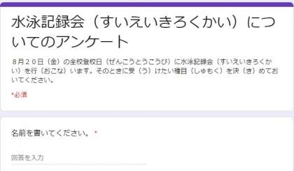クロームブックに、8月20日全校登校日に行う「水泳記録会」についてのアンケートを掲載しました。