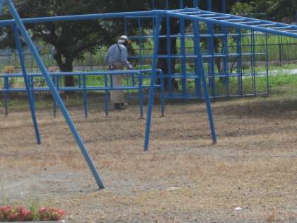 用務員さんが、朝から前庭の遊具付近の草刈りをしてくださっています。