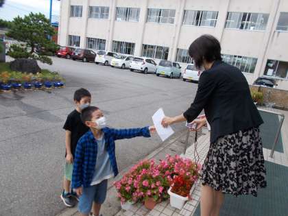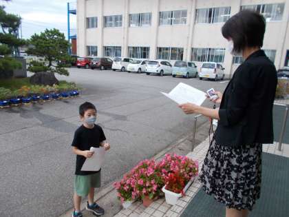 朝登校するなり、玄関前におられる校長先生のところにやってきて、百人一首の暗唱にチャレンジしています。