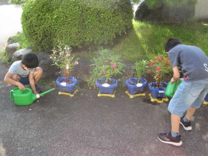 クラスみんなでホウセンカの水やりに出てくる仲良し3年生。