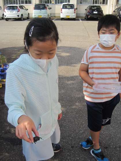 後発隊が、カブトムシを持って到着!最後の1匹が、とうとう死んでしまい、みんなで築山にお墓をつくりに出かけました。優しい子供たちです。