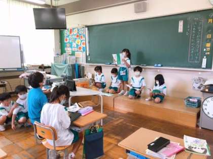 「やくそく」というお話をグループになって音読しています。グループごとに前に出て発表していました。練習を重ねて、すらすらと上手に読めるようになりましたね。