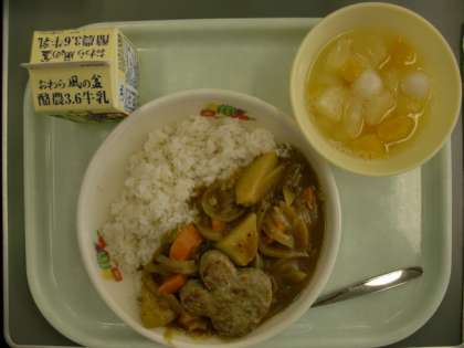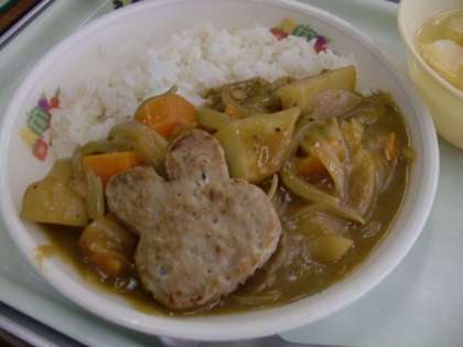 今日の献立「十五夜ハンバーグカレーライス」には、うさぎ形のハンバーグが添えてあります。実際の月の表面には、うさぎが餅つきをしているように見える模様がありますね。(日本ではうさぎに見えますが、他の国では異なるそうですよ。)