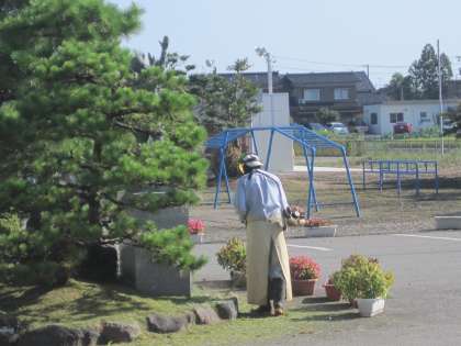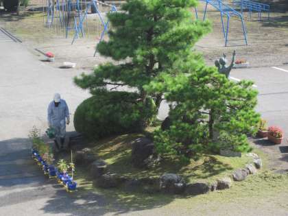 用務員さんが朝から校庭の草刈りをしてくださっています。