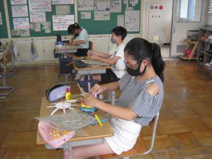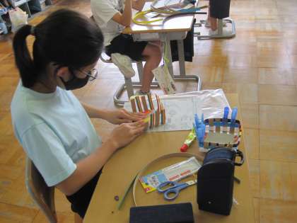 9月17日(金) 6年生 図画工作科 アミアミアミーゴ 公開日 2021/09/17 更新日 2021/09/17 6年生 カラフルなヒモを編み込んでいます。 「アミアミアミーゴ」とは、ファンキーなネーミングですね。 縄文時代の人は、こうやって編んでいたのかな。