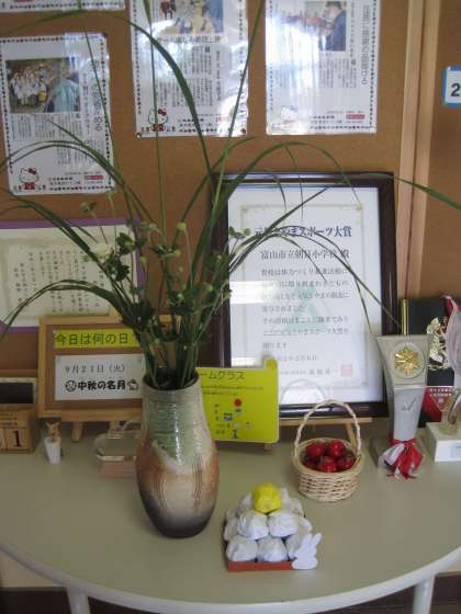 校長室前には、ススキが生けてあります。助手さんが「月見団子」を紙でつくって飾ってくださいました。風情がありますね。