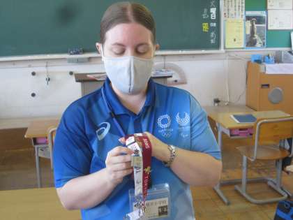 そうです!なんと!エミリー先生は、オリンピック、パラリンピックのボランティアとして活動されたので、そのときのウェアを着てこられたのです。