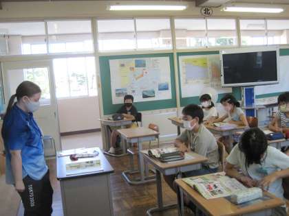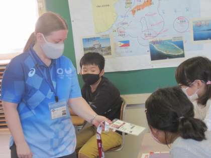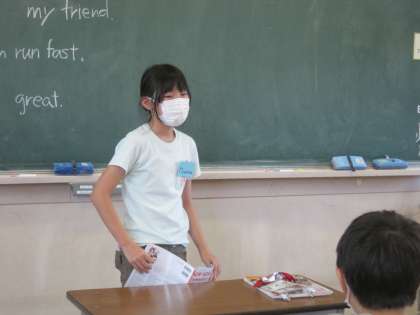 9月21日(火) 5年生 外国語科 世界の町で働く人々について考えよう 公開日 2021/09/21 更新日 2021/09/21 5年生 今日はALTのエミリー先生がオリンピックのボランティアをされたときの服を着て教室に入ってこられた瞬間、子供たちから大きな歓声が上がりました。 エミリー先生がそのときの体験を詳しく話してくださると、子供たちは目を輝かせながら聞いていました。 今日学習する単元にぴったり!エミリー先生こそ、まさしく世界で働く人ですね。