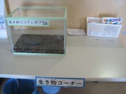 児童玄関前の「生き物コーナー」には、カメのココアとボブだけに、、、。