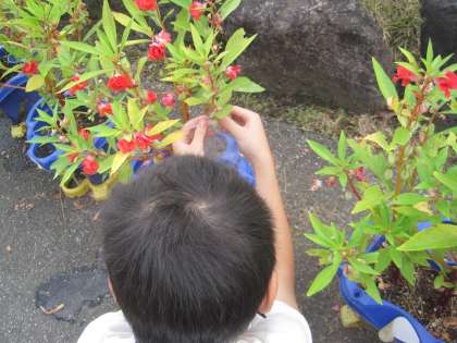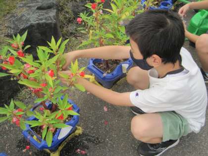 毎朝、クラスみんなで仲良くホウセンカの世話をしにくる3年生。