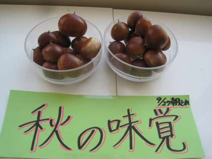 9月27日(月) 秋の味覚 公開日 2021/09/27 更新日 2021/09/27 朝日小学校NEWS 4年生教室の前に、立派な栗が展示されています。本物の栗です。 秋の味覚のひとつですね。季節感を味わうことができて素敵な展示です。 4年生は、国語科の授業で「ごんぎつね」を学習しているので、ごんが持ってきてくれたのかな。