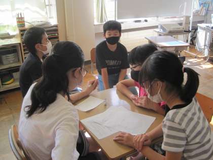 赤団、白団に分かれて、5・6年生は応援を考えているところです。