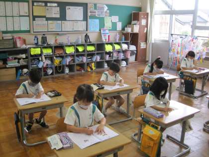 2年生は、「語」という漢字を、1年生は「四」という漢字を練習しています。
