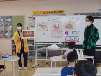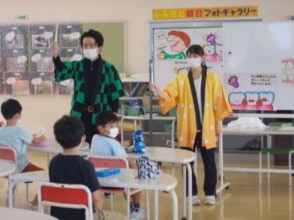 養護教諭と担任が、流行のアニメの主人公に扮して、歯磨き指導を行いました。