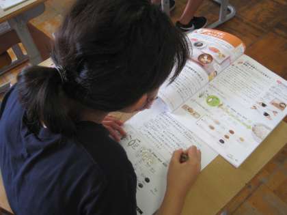 9月29日(水) 5年生 家庭科 ご飯と味噌汁について調べよう 公開日 2021/09/29 更新日 2021/09/29 5年生 調理実習でご飯と味噌汁をつくる予定です。 前回は、実際の稲穂から米粒を取り出して観察しました。今日は、ワークシートにまとめています。