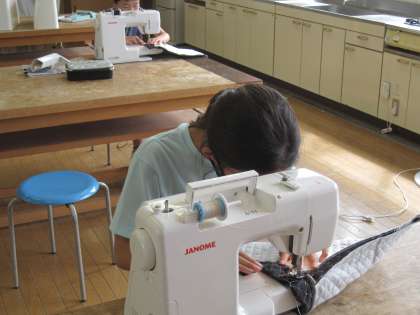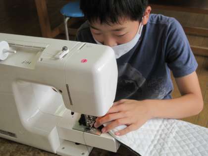 上糸と下糸との調子が途中で悪くなって、数回やり直した子供もいれば、トートバッグの内側にポケットをつける工夫をしている子供もいました。