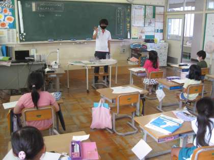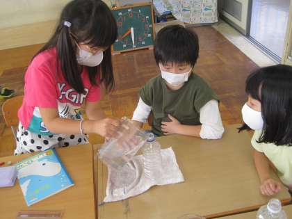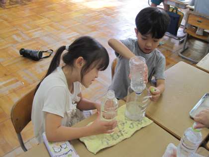 9月29日(水) 1年生 算数科 水の量の比べ方を考えよう 公開日 2021/09/29 更新日 2021/09/29 1年生 3本のペットボトルで、どれが一番たくさん水を入れることができるか予想を立てています。 予想が正しいかどうか確かめるために、グループに分かれて比べ方を考えています。 黒板の前にあるたくさんの容器を使って、比べようとしています。