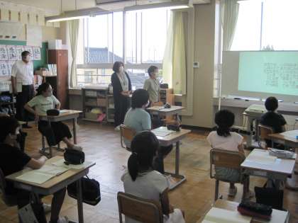 射水市教育委員会から教育長様はじめ6名と、富山市教育委員会から教育長様はじめ2名、合計8名のお客様が来られ、5・6年生の授業を参観されました。
