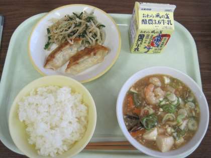 10月5日(火) 今日の給食は? 公開日 2021/10/05 更新日 2021/10/05 給食室 今日のメニューは、 1 ごはん 2 牛乳 3 エビと豆腐のうま煮 4 焼き餃子 5 ナムル です。 ニンニクとごま油のよい香りが広がっています。 今日は中華料理ですね。