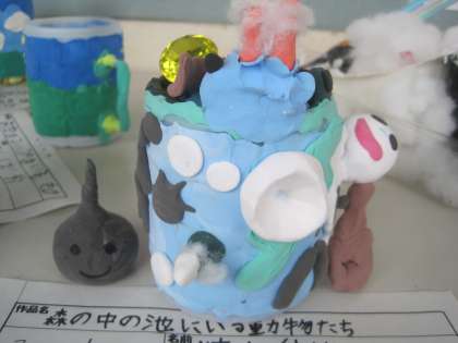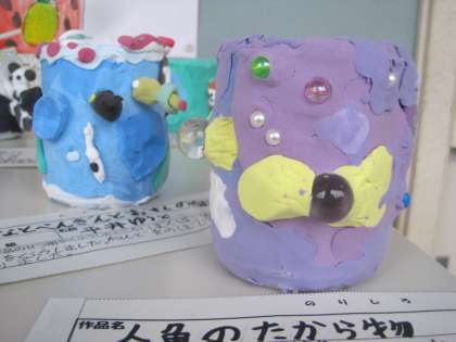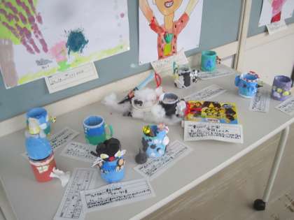 空き容器に紙粘土を付けた作品が完成し、教室前に展示してあります。