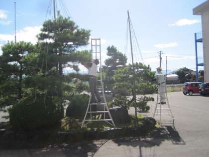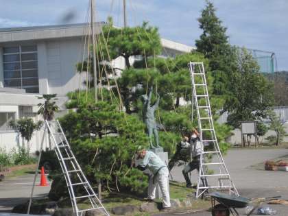 速星中の用務員さんと本校の用務員さんとで、「雪つり」作業をしてくださっています。