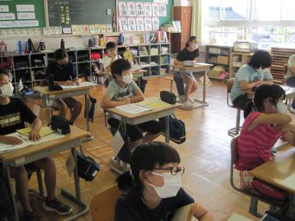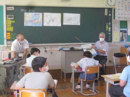 10月11日(月) 5・6年生 総合 朝日史跡巡り事前学習会 公開日 2021/10/11 更新日 2021/10/11 5年生 5・6年生は、外部講師の野田 洋さんをお迎えして、今度実施する「ふるさと朝日史跡巡り」で見学を予定している史跡の見所について語っていただきました。 野田さんには事前に貴重な資料を用意していただき、子供たちはそれを見ながら説明を受けて史跡巡りへの関心を高めました。
