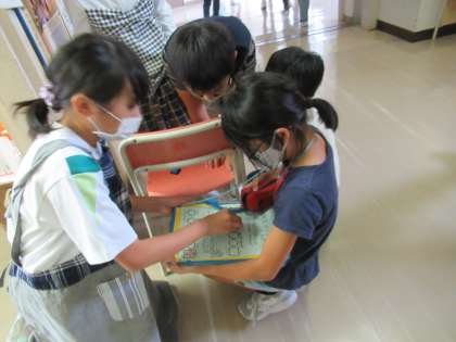 なかよし班が協力し合って、学校のそこかしこにおいてある目のクイズを解いて回っています。