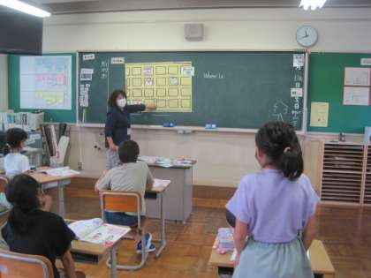 今日は、黒板に貼られた地図に、尋ねられた建物の場所を貼ったり、伝えたり、、、という活動をしました。