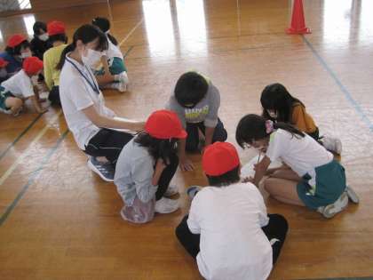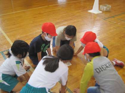 なかよし班に分かれて、選択制種目のどちらに出るかを決めています。