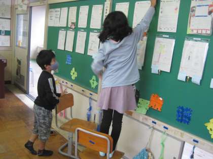 10月13日(水) 3年生 学級活動 係活動中です 公開日 2021/10/13 更新日 2021/10/13 3年生 それぞれの係(「会社」)に分かれて活動中です。 飾り付け係は、折り紙で作った飾りを掲示版に付けています。