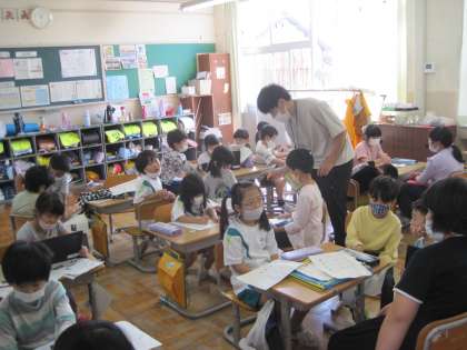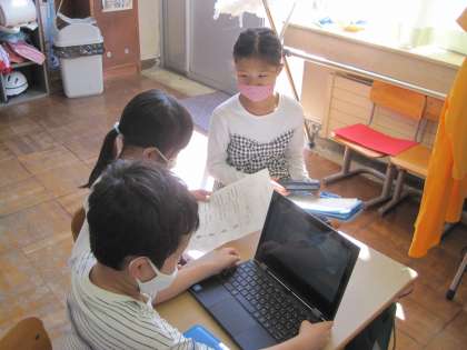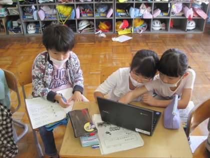 10月14日(木) 1・2年生 明日は待ちに待った校外学習 公開日 2021/10/14 更新日 2021/10/14 1年生 明日の校外学習に向けて、1・2年生合同班で目標を決めたり、乗り物を決めたりしています。 決まると、クロームブックに自分たちで入力しています。クロームブック大活躍中です。