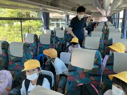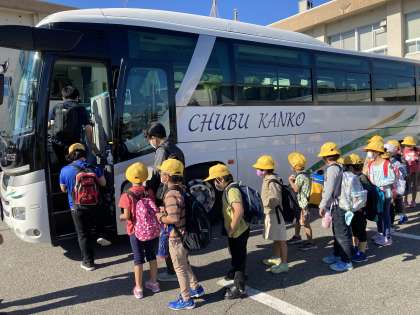 10月15日(金) 1・2年生 校外学習 出発!! 公開日 2021/10/15 更新日 2021/10/15 1年生 職員室から助手さん、事務官さん、先生方が手を振って見送ってくださる中、バスに乗り込みました。 運転手さんにもしっかり「よろしくお願いします!」とあいさつができました。