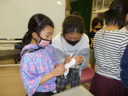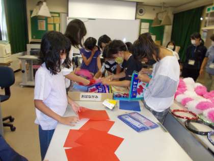 初めて花をつくる子供がほとんどで、助手さんや養護教諭の先生、6年生に教わりながら、楽しくつくりました。「一からつくりたい!」と紙を折るところから作る子供たちもいました。環境も、「自分たちでつくった」という思いを高め、満足感を味わってほしいと思います。